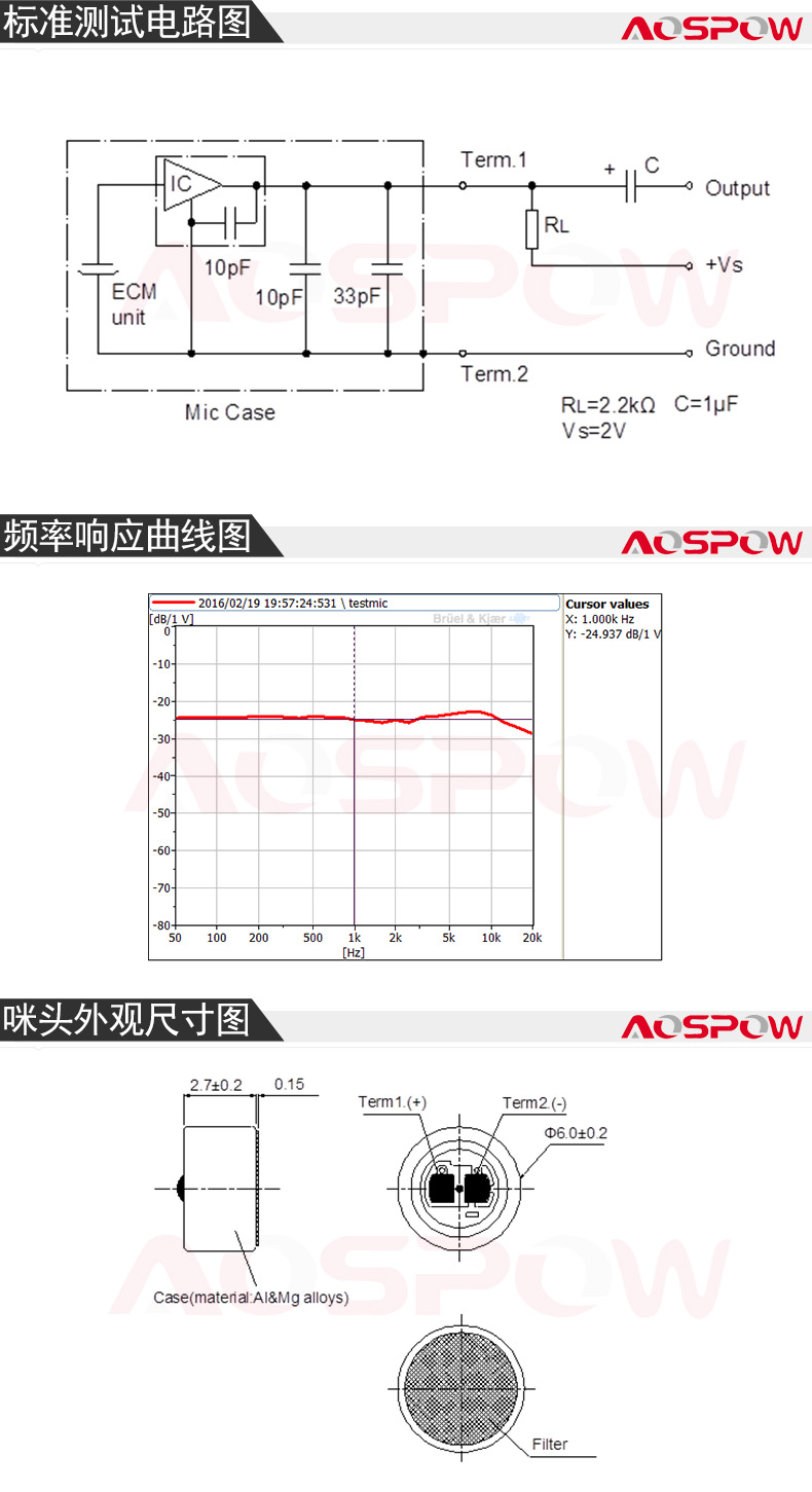 型號:AS-B6027AL26-941類型:駐極體傳聲器(咪頭)指向性:全指向信噪比:56dB靈敏度:-26±2dB輸出阻抗:2.2KΩ(歐姆)規格尺寸:6.0*2.7(mm)頻率響應:50-20000Hz消耗電流:270(Max) μA最大聲壓級:110 dB