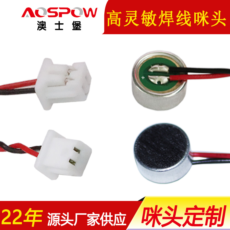 澳士堡mic廠家供應9mm焊線咪頭、端子線咪芯、9745高靈敏音頭,采用韓國RF管芯、質(zhì)量穩(wěn)定可靠,(-30dB靈敏度)保證遠距離拾音效果,適用于遠距離拾音器材、電容式麥克風等產(chǎn)品。
