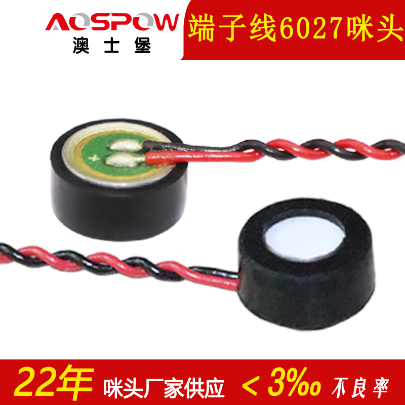 澳士堡mic廠家供應絞線高靈敏焊線咪芯、6027端子線咪頭、-30dB靈敏度保證有效拾音距離,適用于智能機器人、采訪麥克風等設備產品領域。