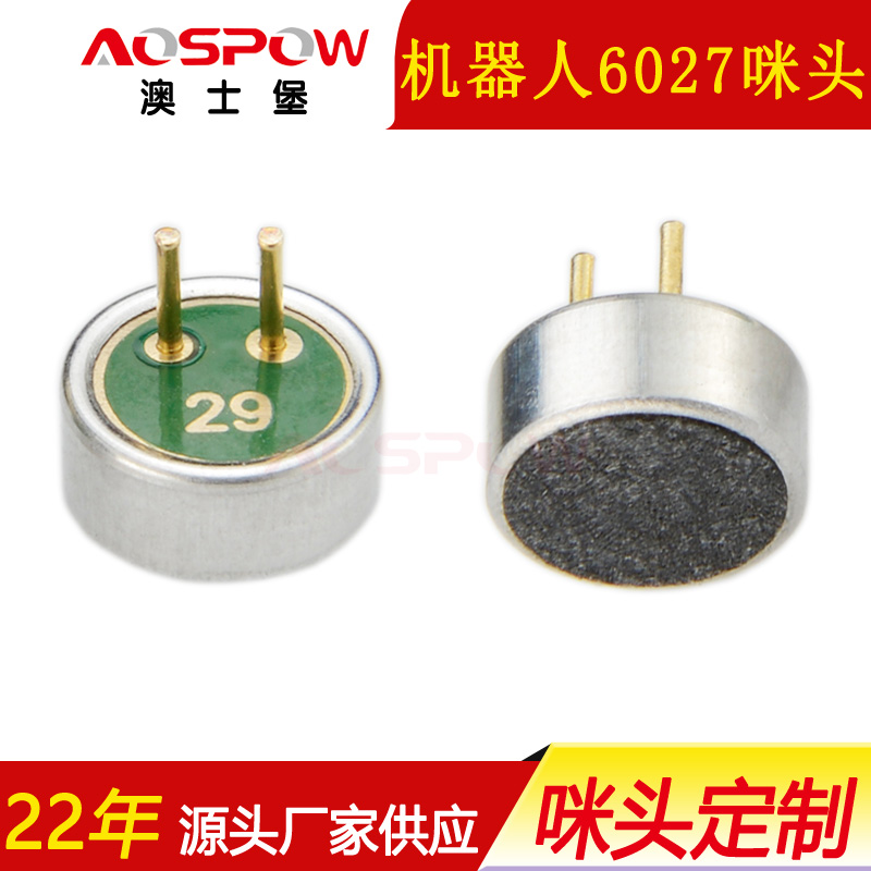 澳士堡降噪咪頭工廠生產的6027全指向插針咪頭具有高靈敏高信噪、內置雙電容高音質等特點,主要應用在:智能機器人、戶外拾音器材等產品領域。