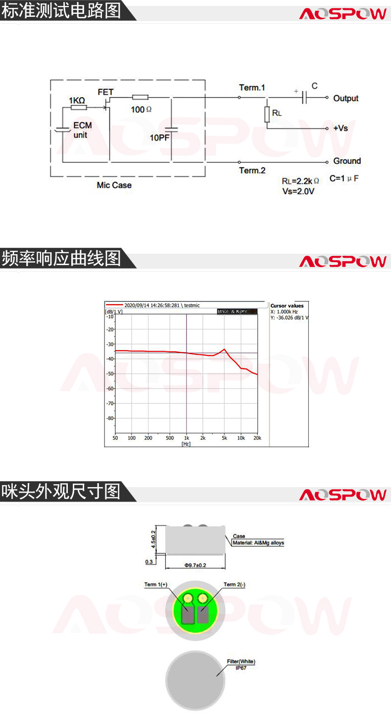 型號:AS-F9745AL36-IP67類型:駐極體傳聲器(咪頭)指向性:全指向咪頭信噪比:65dB靈敏度:-36±2dB(可定制)輸出阻抗:2.2kΩ(歐姆)規格尺寸:9.7*4.5(mm)頻率響應:20-16000Hz消耗電流:500(Max) μA最大聲壓級:110dB